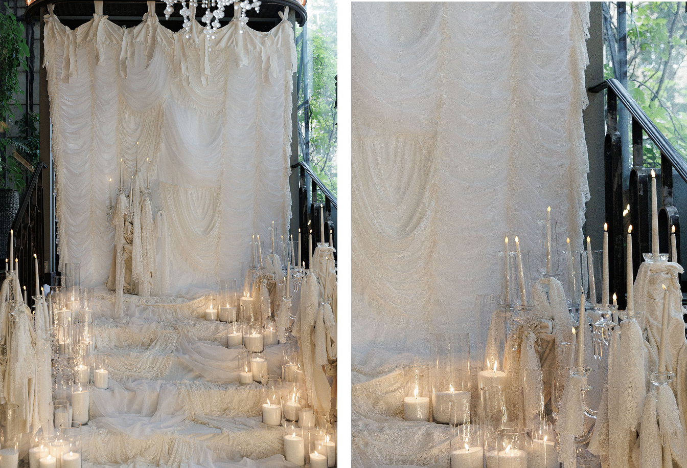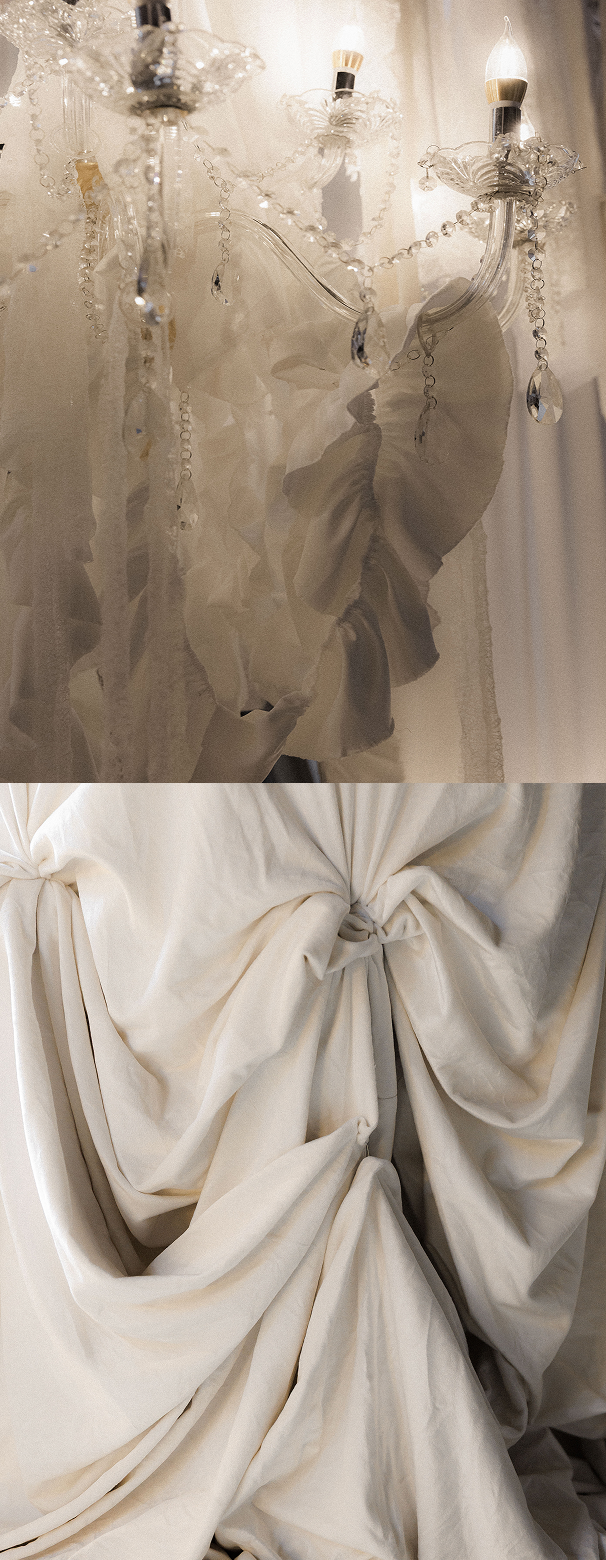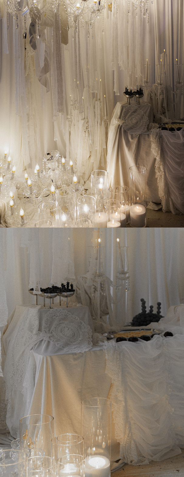 Сложные «архитектурные элементы» барокко мы передали через драпировки: отшили вручную все текстильные элементы декора, дополнили особой коллекцией посуды и канделябрами.